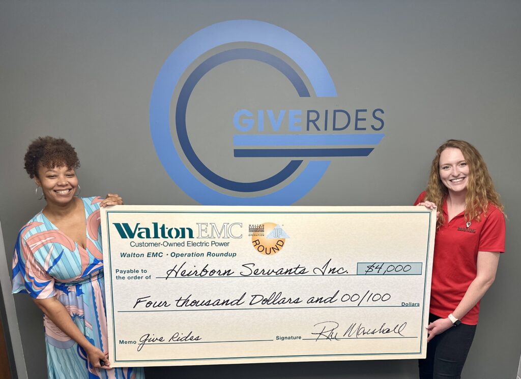 Heirborn Servants Project Manager Tiffany Castro, left, accepts an Operation Round Up donation from Walton EMC Communications Specialist Morgan Spivey. The funds will help to provide transportation for single mothers and trafficking victims.