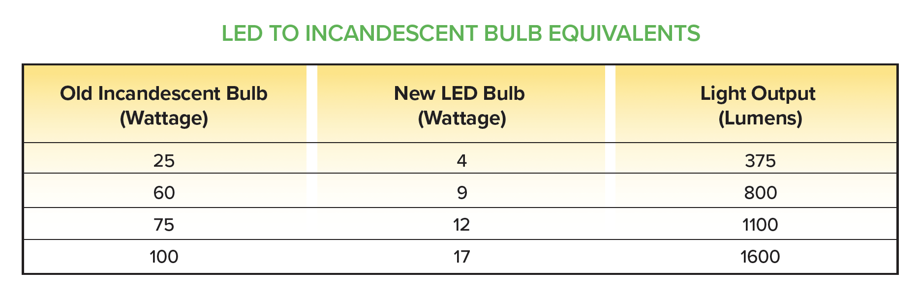 LIGHT OUTPUT (BRIGHTNESS) | Look for lumens, not watts. Watts measure energy use; lumens measure brightness. For example, a 60-watt incandescent bulb gives off about 800 lumens. If you want the same brightness in an LED, look for one that provides 800 lumens but only uses about 9 to 12 watts.